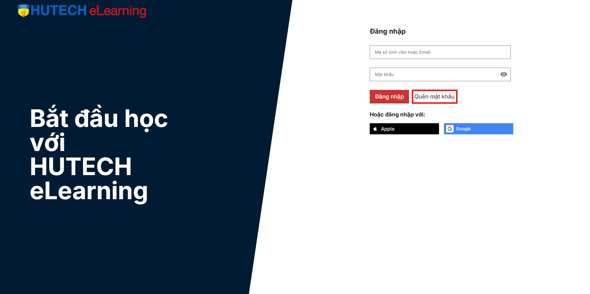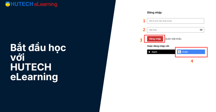 Truy cập vào trang lms.hutech.edu.vn -> chọn menu Đăng nhập và thực hiện theo các bước 1-2-3 hoặc liên kết Google với Email đã đăng ký (bước 4).
