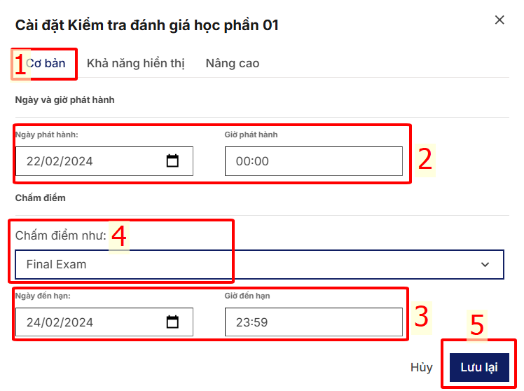 Để thiết lập thời gian nộp bài cho các bài kiểm tra trắc nghiệm hoặc tự luận, Giảng viên thực hiện theo các bước sau: