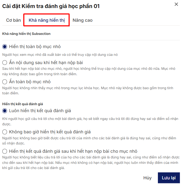 Ngoài ra, Giảng viên có thể tham khảo thêm lựa chọn hình thức nộp bài khác tại menu Khả năng hiển thị và Menu Nâng cao