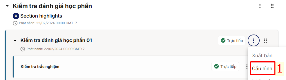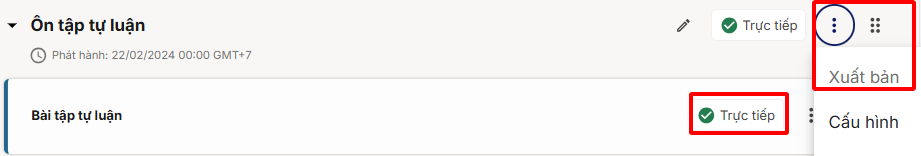 Lưu ý: Sau khi cài đặt xong, Giảng viên cần nhấp biểu tượng ba chấm (…) → Chọn Xuất bản để đảm bảo nội dung bài kiểm tra được hiển thị.