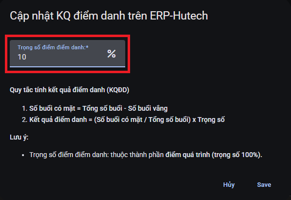Nhập giá trị Trọng số điểm điểm danh (%). Giảng viên có thể xem quy tắc tính điểm danh được hiển thị trực tiếp như trên hình.