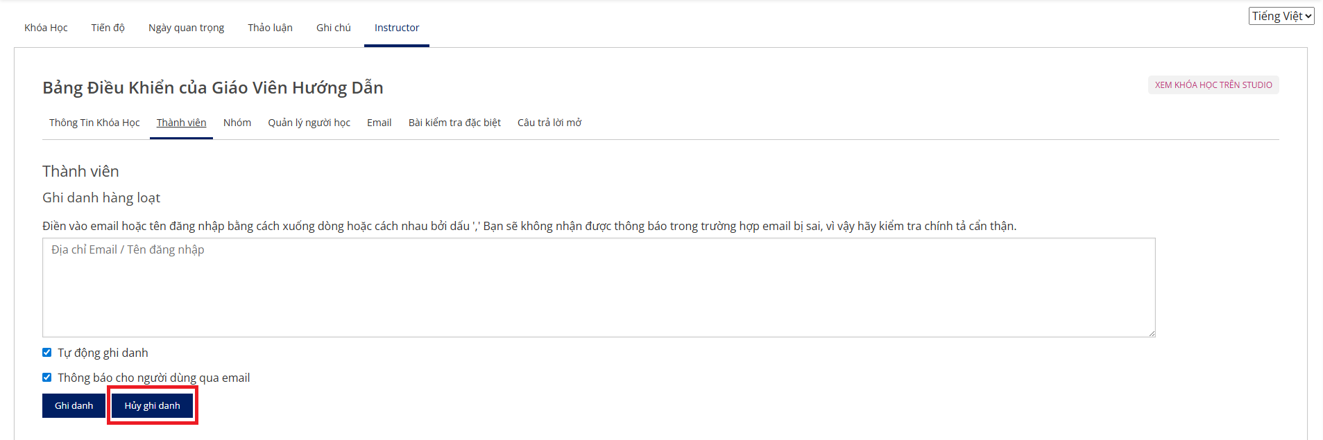 Để hủy người học ra khỏi khóa học, Giảng viên làm theo các bước trên và chọn nút “Hủy ghi danh”