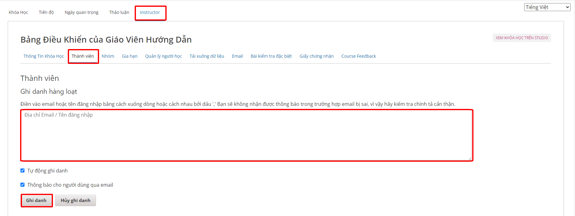 Để ghi danh người học vào khóa học, giảng viên làm theo các bước sau: