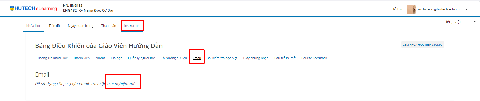 - Truy cập trang web lms.hutech.edu.vn -> Vào khóa học cần gửi mail.