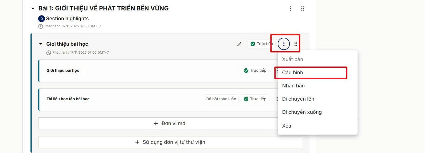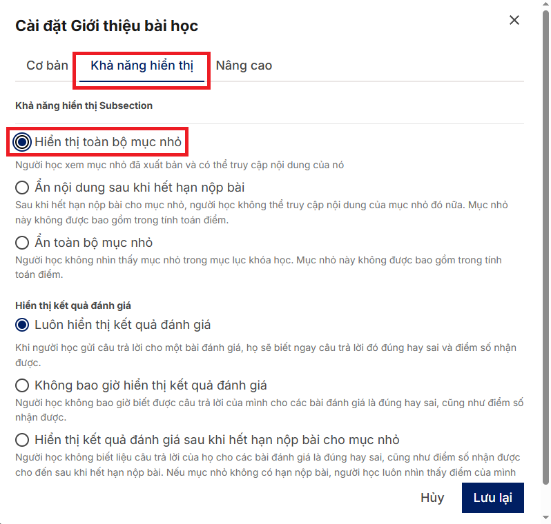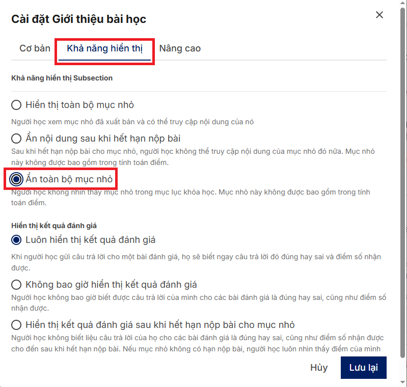 - Tiến độ (Progress Tracking): Các mục bị ẩn hoặc chỉ hiển thị cho một nhóm cụ thể sẽ ảnh hưởng đến tiến độ khóa học của người học.