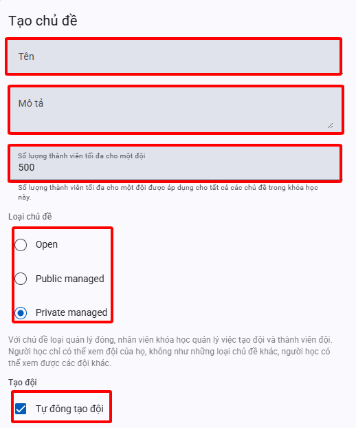 | Tên: Tên chủ đề (ví dụ: Nhóm thuyết trình, Nhóm bài tập lớn). Mô tả: Mô tả nội dung/mục đích của chủ đề . Số lượng người học tối đa cho một đội: • Giới hạn tối đa số người học có thể tham gia mỗi nhóm. Thông thường nên đặt lớn hơn số người học dự kiến để tránh bị lỗi. Loại chủ đề: • Open: Người học có thể tự tham gia hoặc rời khỏi nhóm. • Public_managed: Giảng viên quản lý nhóm, người học nhìn thấy danh sách nhóm. • Private_managed: Chỉ giảng viên thấy và quản lý nhóm, người học không thể nhìn thấy và không tự tham gia được. Tự động tạo đội: • Giữ nguyên checkbox Tự động tạo đội (mặc định được chọn). Hệ thống sẽ tự tạo các nhóm dựa trên số lượng người học mỗi nhóm. Số lượng người học mỗi đội: • Nhập số lượng người học muốn có trong mỗi nhóm . Phương pháp phân bổ: • Chọn Randomly → Hệ thống sẽ tự động phân bổ người học vào các nhóm một cách ngẫu nhiên. | ![]() ![]() |