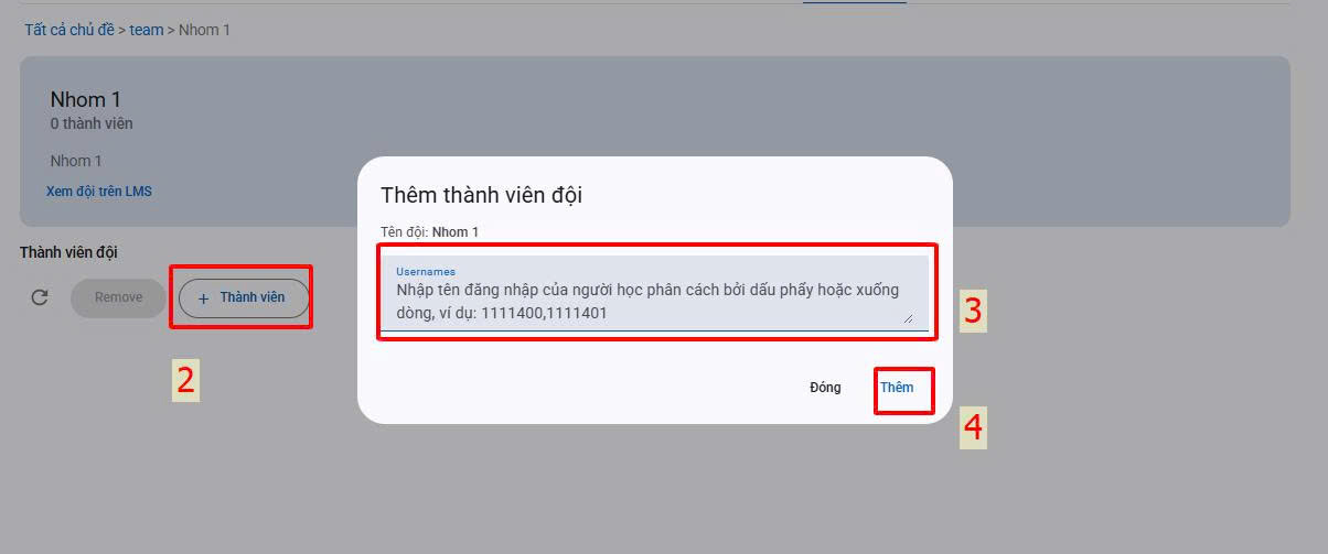 - Mở từng đội (1) → chọn Thêm thành viên (2),(3),(4)