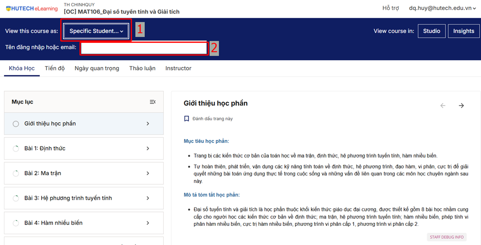 Truy cập vào lms.hutech.edu.vn→ chọn khóa học -> chọn mục "Specific student..." (1) -> Nhập email hoặc mã người học cần kiểm tra. (2)