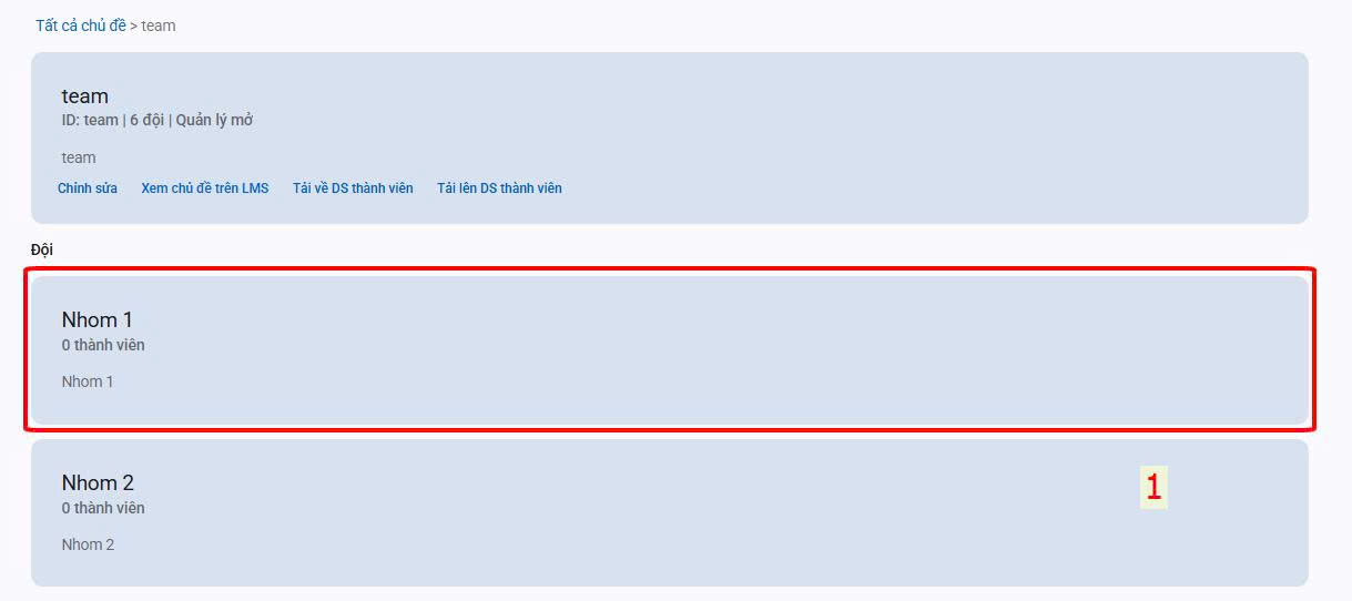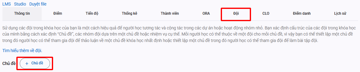Chọn tab Đội để quản lý các nhóm của khóa học.