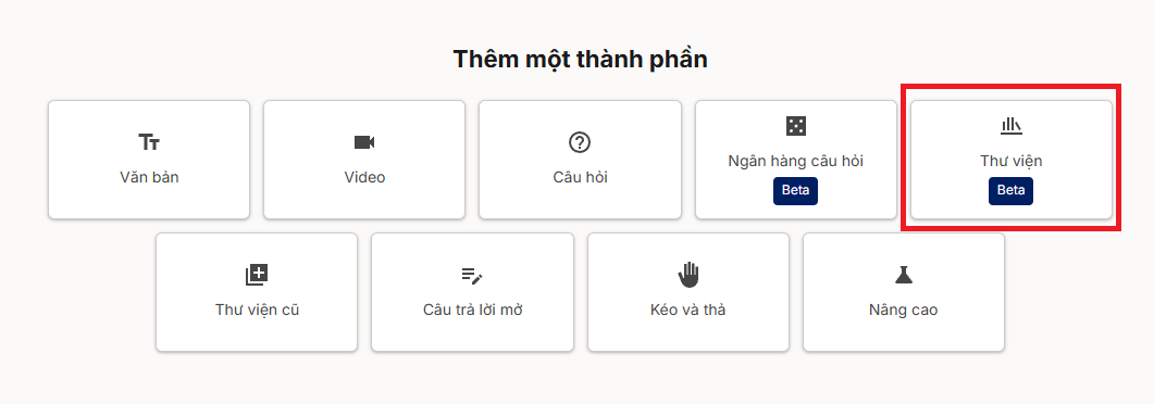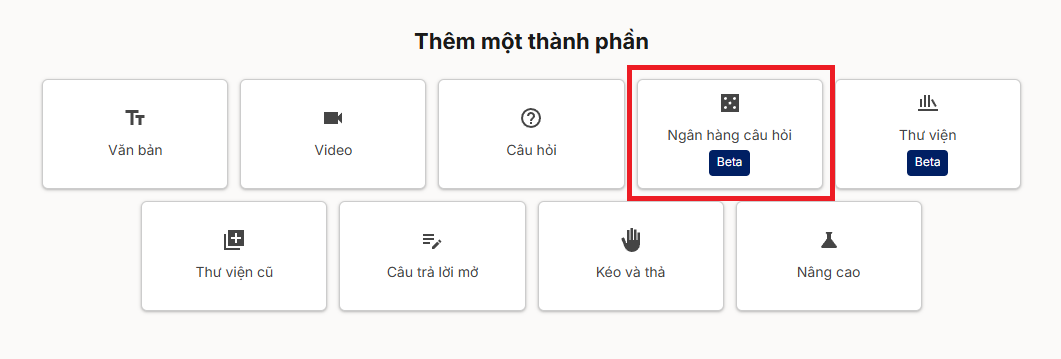 Giảng viên tùy chọn vào phần muốn cho người học kiểm tra. Sau khi đã chọn xong, giảng viên chọn mục “Ngân hàng câu hỏi” ở phần “Thêm một thành phần”