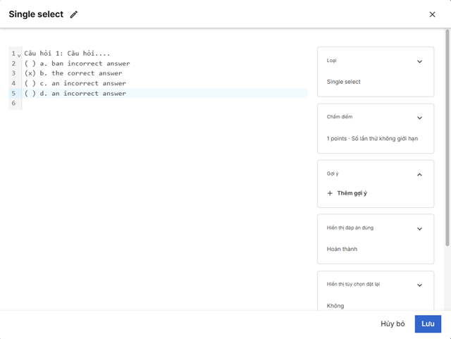 Đầu tiên, giảng viên cần chuẩn bị sẵn một bộ đề giống với format của trình chỉnh sửa Markdown xem mẫu tại đây. Sau đó, giảng viên liên hệ với Trung tâm Dạy học số để Trung tâm tiến hành tạo bộ đề và cấp quyền chỉnh sửa cho giảng viên vào ngân hàng đề.